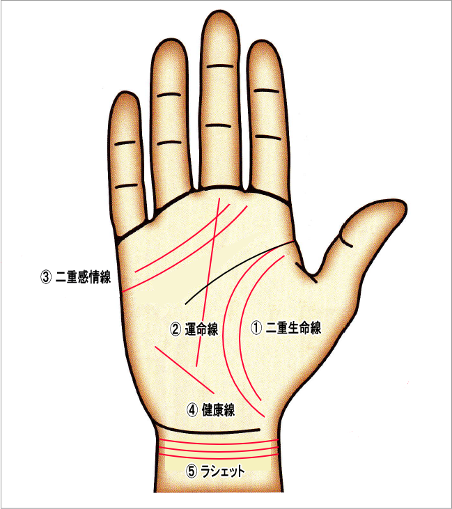 | 二重生命線がある・・ | 人の2倍の生命力。体質的に元気で丈夫。運勢も強い傾向がある。 | |