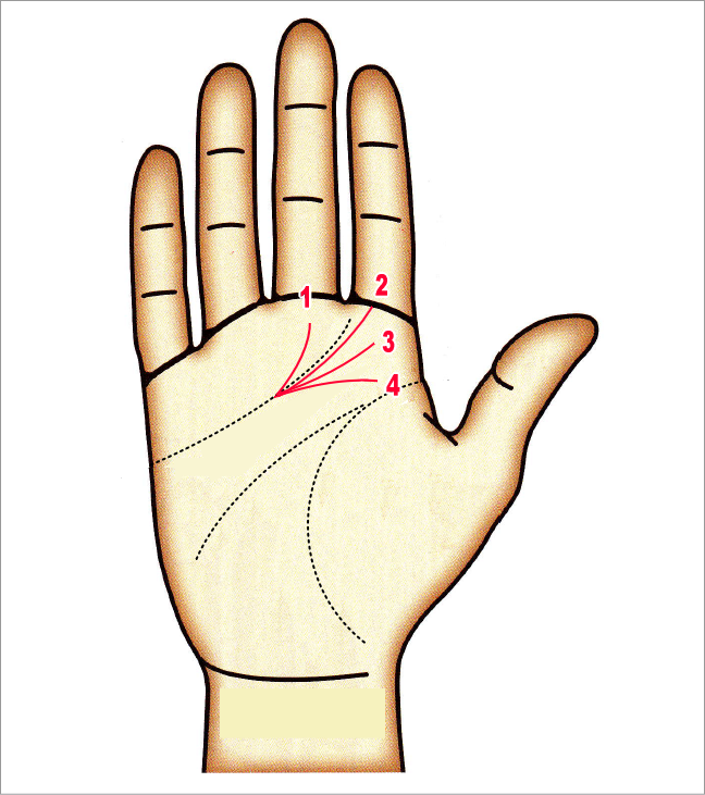 | 感情線の起点の高さ・・ | 感情線と指の付け根までの空間は心のキャパシティの広さを示す。 起点が高いほど自己中心的で起点が低いほど強調性が高くなります。 |