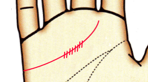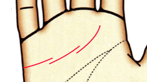 愛情面での不満や人間関係のトラブルの暗示。感情的になって恋人や人間関係を失わないように。また、薬指の下は目の疲れ、小指の下は乱れている場合も含めて生理痛等の婦人科系のトラブルを暗示することも。また感情線は心臓との関りもあるので注意が必要です。